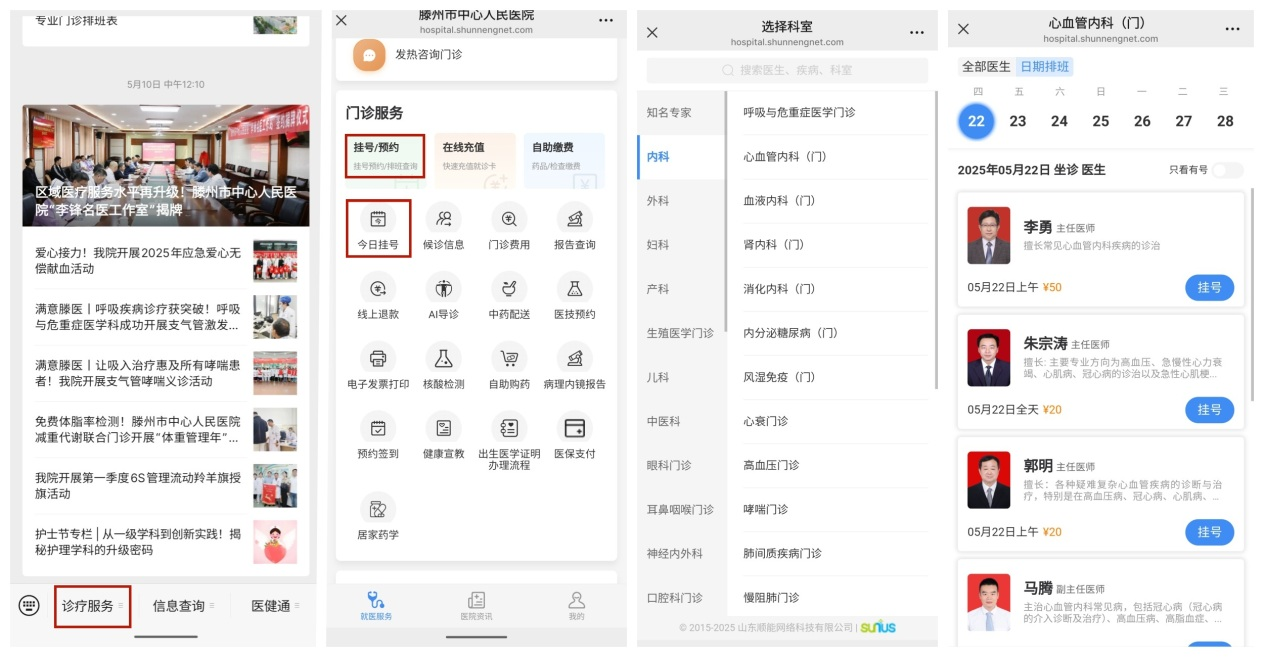 12、醫生門診坐診時間:關注滕州市中心人民醫院微信公眾號,支付寶(生活號、小程序)及滕州市中心人民醫院官網,均能及時查看門診醫生出診情況。