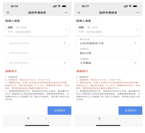 2、用戶閱讀申請內容和注意事項后,點擊下一步。選擇檢測人、城市,并填寫居住地址、申請原因等,點擊立即支付。如下圖:? ? ??