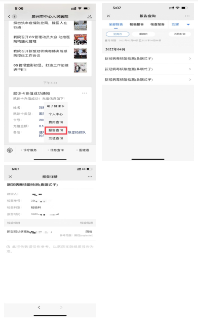 在使用“核酸檢測”服務前,用戶首先要關注我院“滕州市中心人民醫院”微信公眾號,并綁定就診卡。