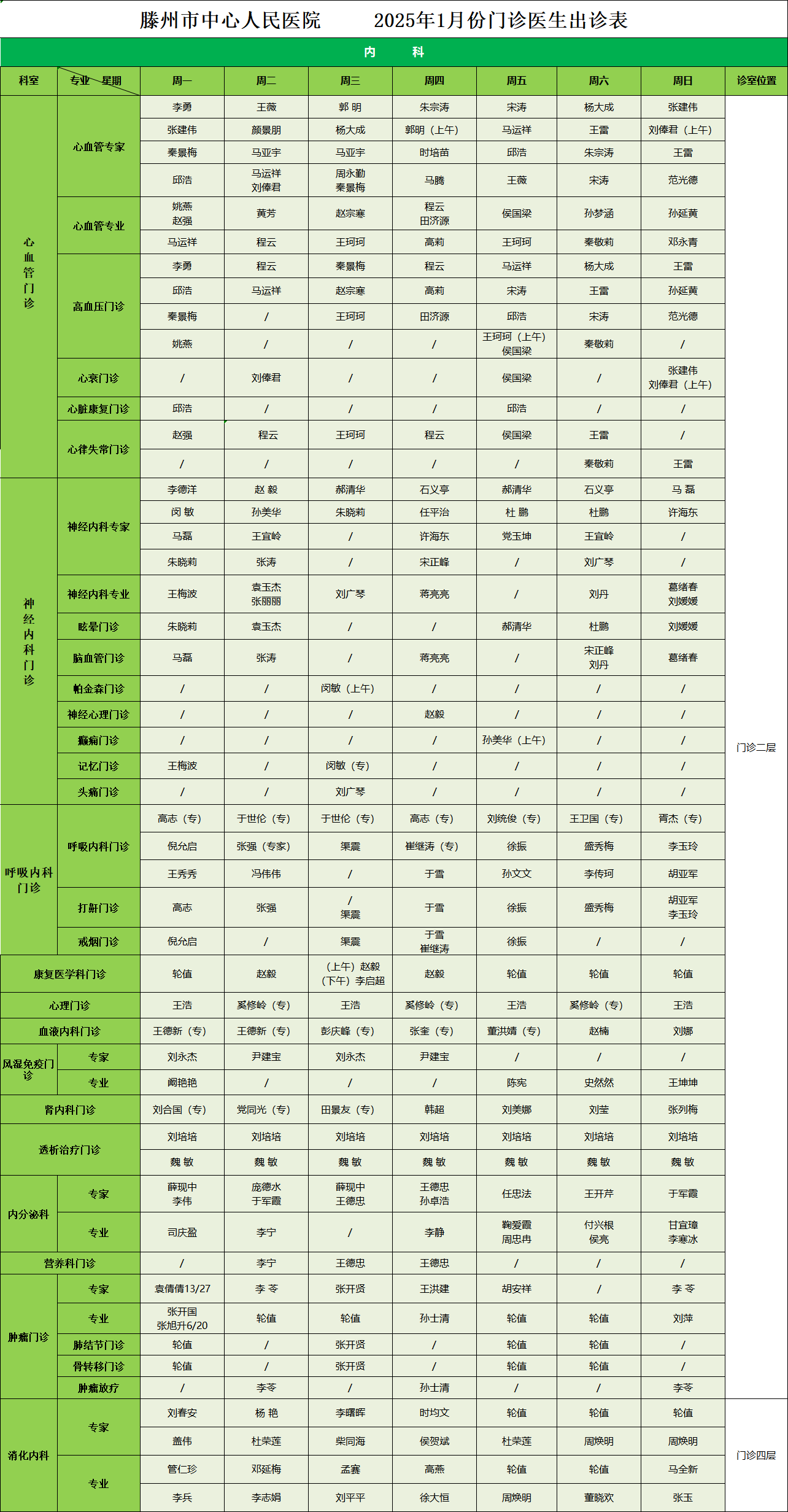 關注 | 滕州市中心人民醫院1月份專家、專業門診排班表