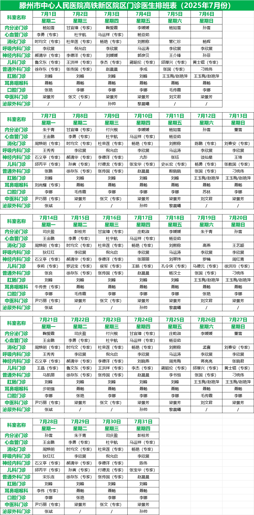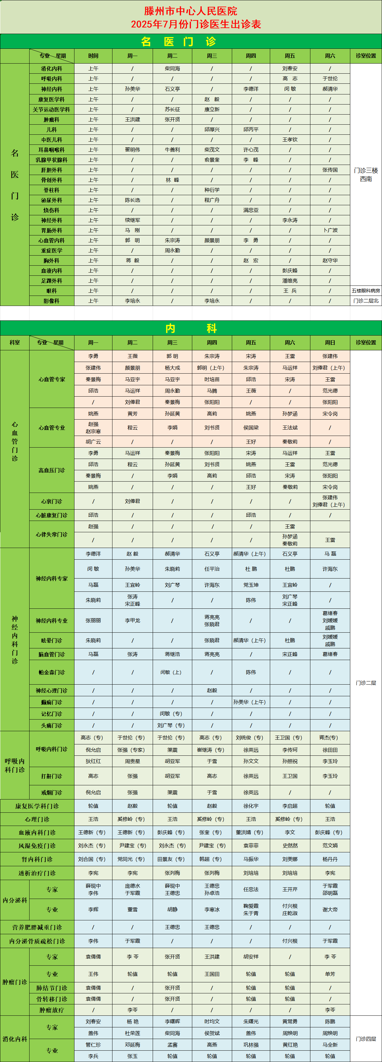 關注 | 滕州市中心人民醫院7月份專家、專業門診排班表