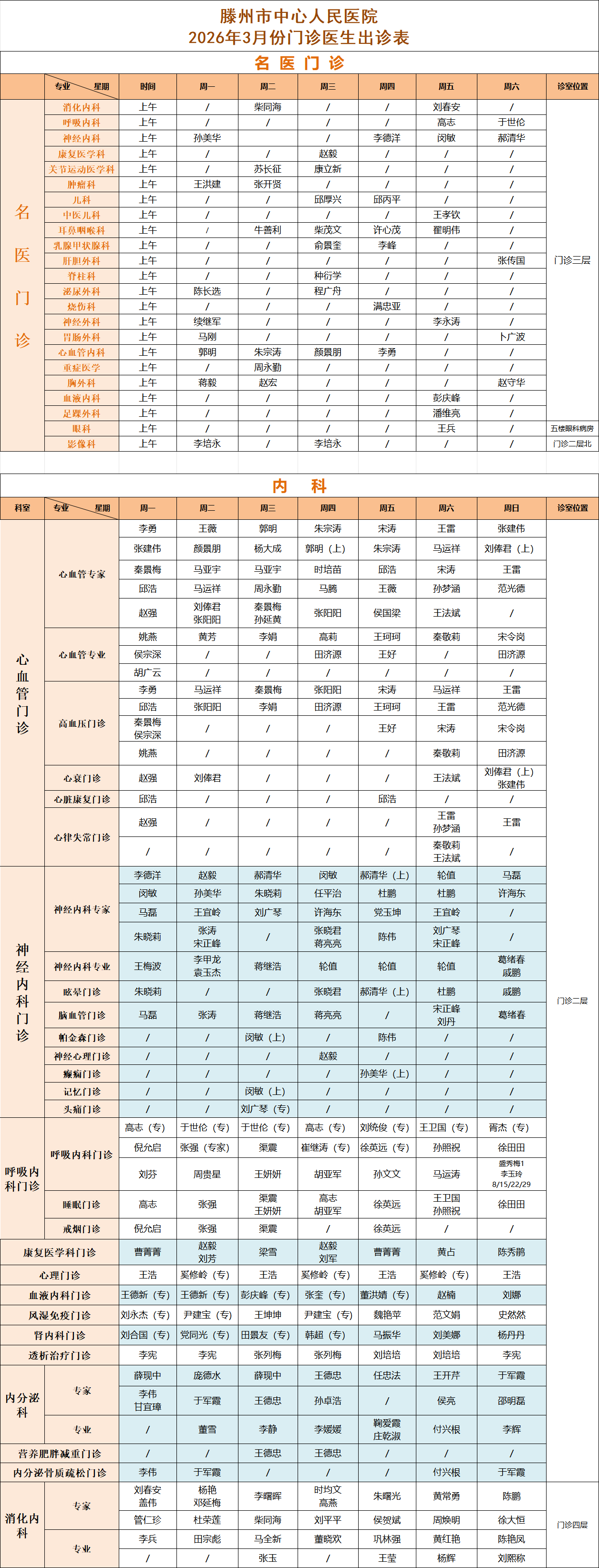 關注 | 滕州市中心人民醫院3月份專家、專業門診排班表