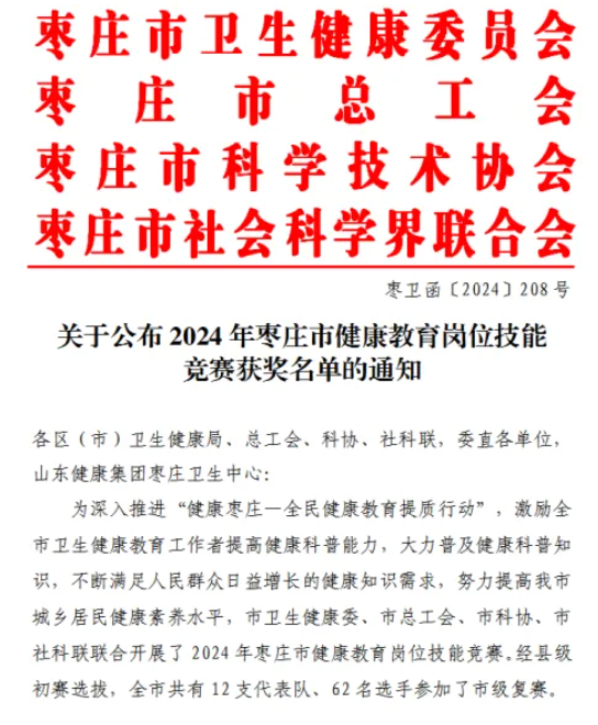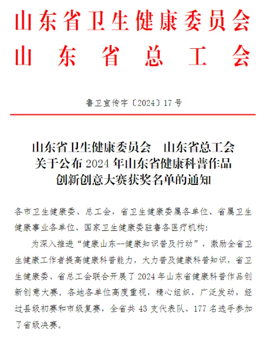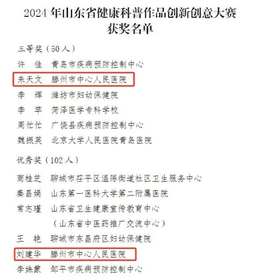 我院共318名醫務人員參賽,榮獲滕州市級一等獎20人、二等獎35人、三等獎52人、優秀獎89人。其中,6人通過滕州市級健康教育和艾滋病防治技能競賽選拔,參加棗莊市及山東省競賽。足踝外科朱天文和婦科劉建華在棗莊市健康教育崗位技能競賽分獲一等獎和二等獎,并代表棗莊市參加山東省健康科普作品創新創意大賽,榮獲三等獎和優秀獎。