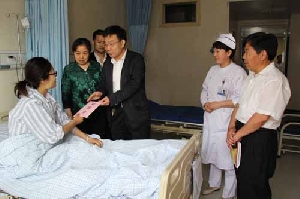 5月5日,市中心人民醫院黨委書記朱恒科、工會主席生國棟來到血液內科,在詳細詢問了急性白血病患者孔敏的病情后,將滕州市慈善總會市中心人民醫院分會籌集的5000元愛心救助