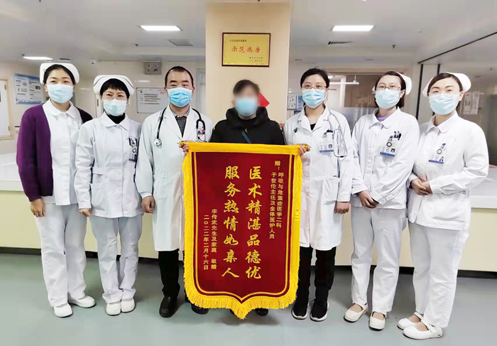 近日,一面寫著“醫(yī)術精湛品德優(yōu),服務熱情如親人”的錦旗送到了我院呼吸與危重癥醫(yī)學二科。患者家屬被于世倫主任醫(yī)師精湛的醫(yī)術及全體醫(yī)護人員的熱情服務所感動,特送錦旗一面,以表達對呼吸二科全體醫(yī)護人員的感激之情。