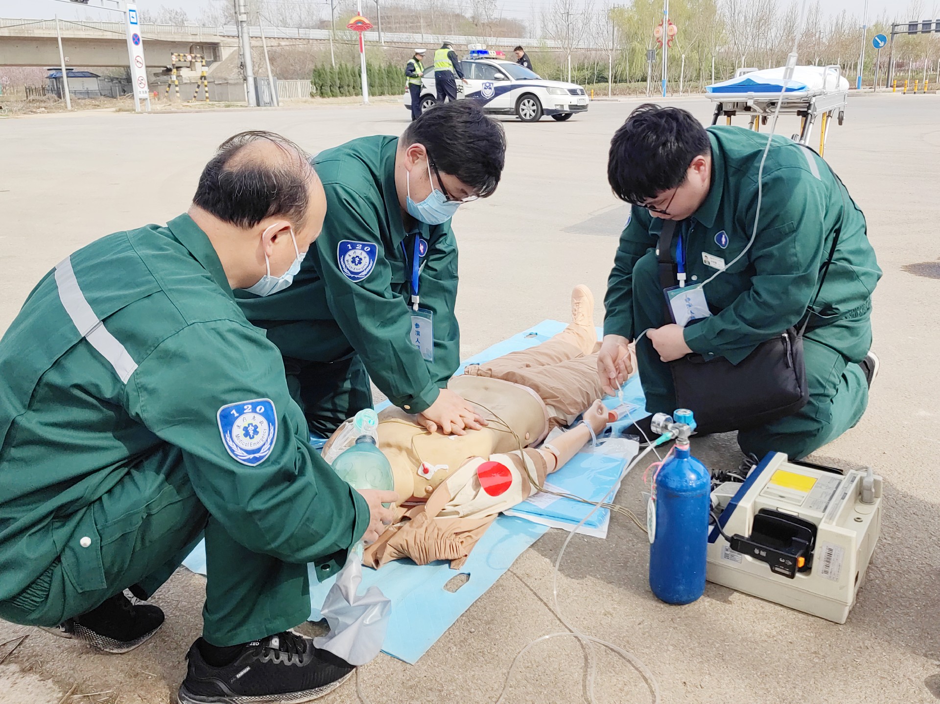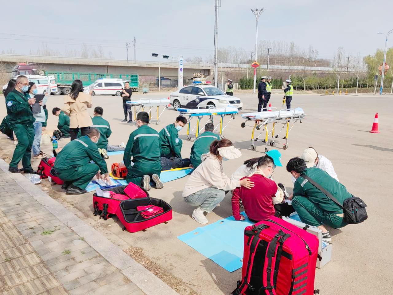 15:30演練正式開始。演練場景為高速公路發(fā)生多車相撞,造成多人不同程度受傷。院前急救接到出車指令后立即調派多輛救護車趕赴現場,調度員立即向科主任匯報。到達現場后,院前醫(yī)生快速分類檢傷發(fā)現有6名傷員(模擬),其中一人當場死亡(模擬),其余5名傷員(模擬)頭部、軀干、四肢不同程度受傷。交警立即封閉道路,封鎖事故現場,拉起警戒線,為現場救治提供安全保障。