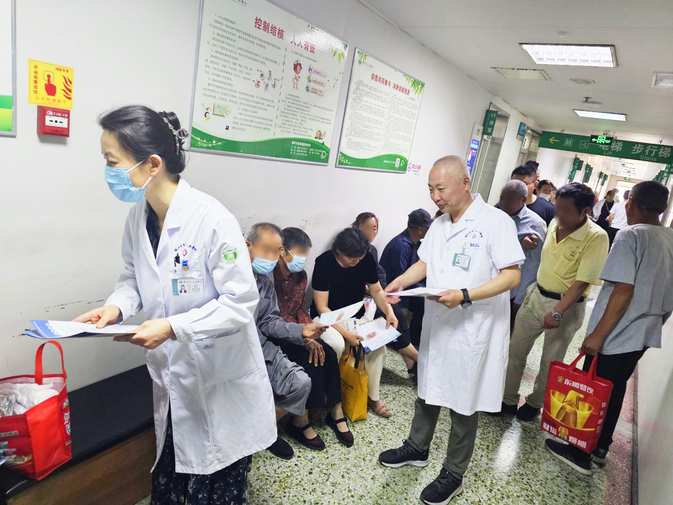 醫務人員在內科候診區向群眾,講解煙草危害和吸煙容易誘發的多種疾病及預防常識,并發放控煙宣傳材料。