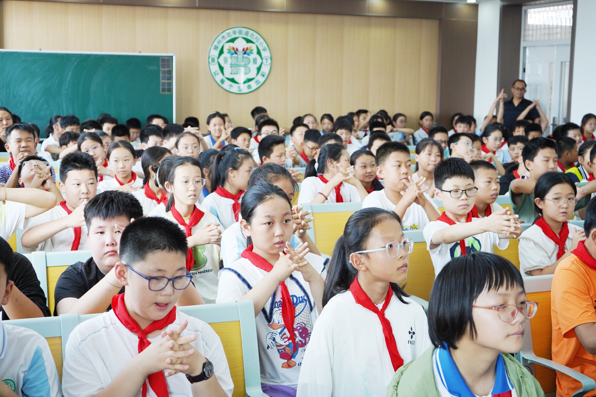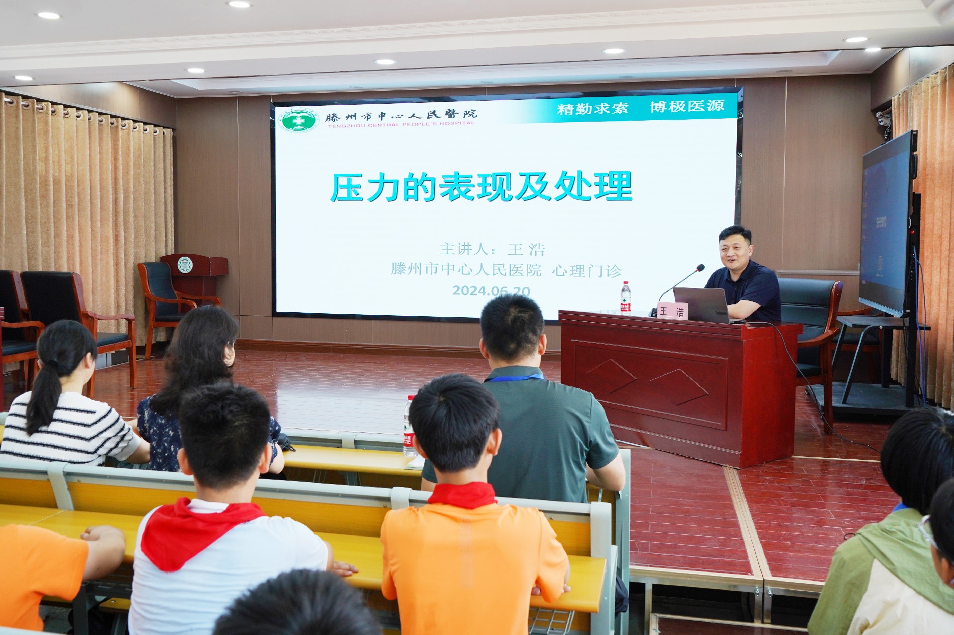 在學校禮堂,心理門診王浩醫生為孩子們帶來了生動有趣的心理健康講座《壓力相關表現及處理》。通過講解壓力的來源,面對考試時學生的高喚起水平、低喚起水平對成績的影響,以及情緒的察覺、接納、允許、轉化和升華的過程,讓孩子們在輕松愉快的氛圍中學會了自我情緒的識別,應用“著陸技術”“手勢技術”“蝴蝶抱”等實用有效的方法及時調整自己的壓力反應。
