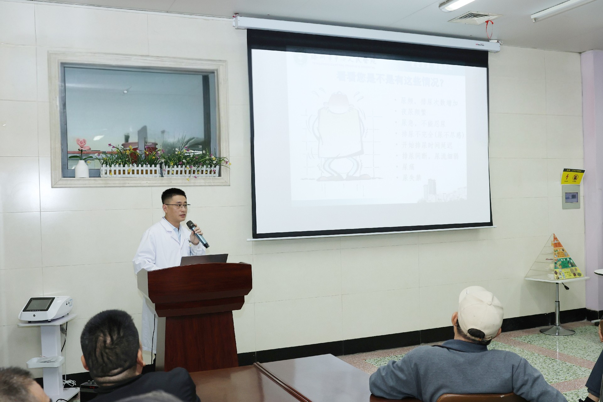活動現場,免費為男性進行前列腺腫瘤標志物篩查,并就咨詢問題進行現場解答,同時提供測血壓、血糖服務。泌尿外科二病區副主任高小超在健康講堂為群眾進行主題科普講座。
