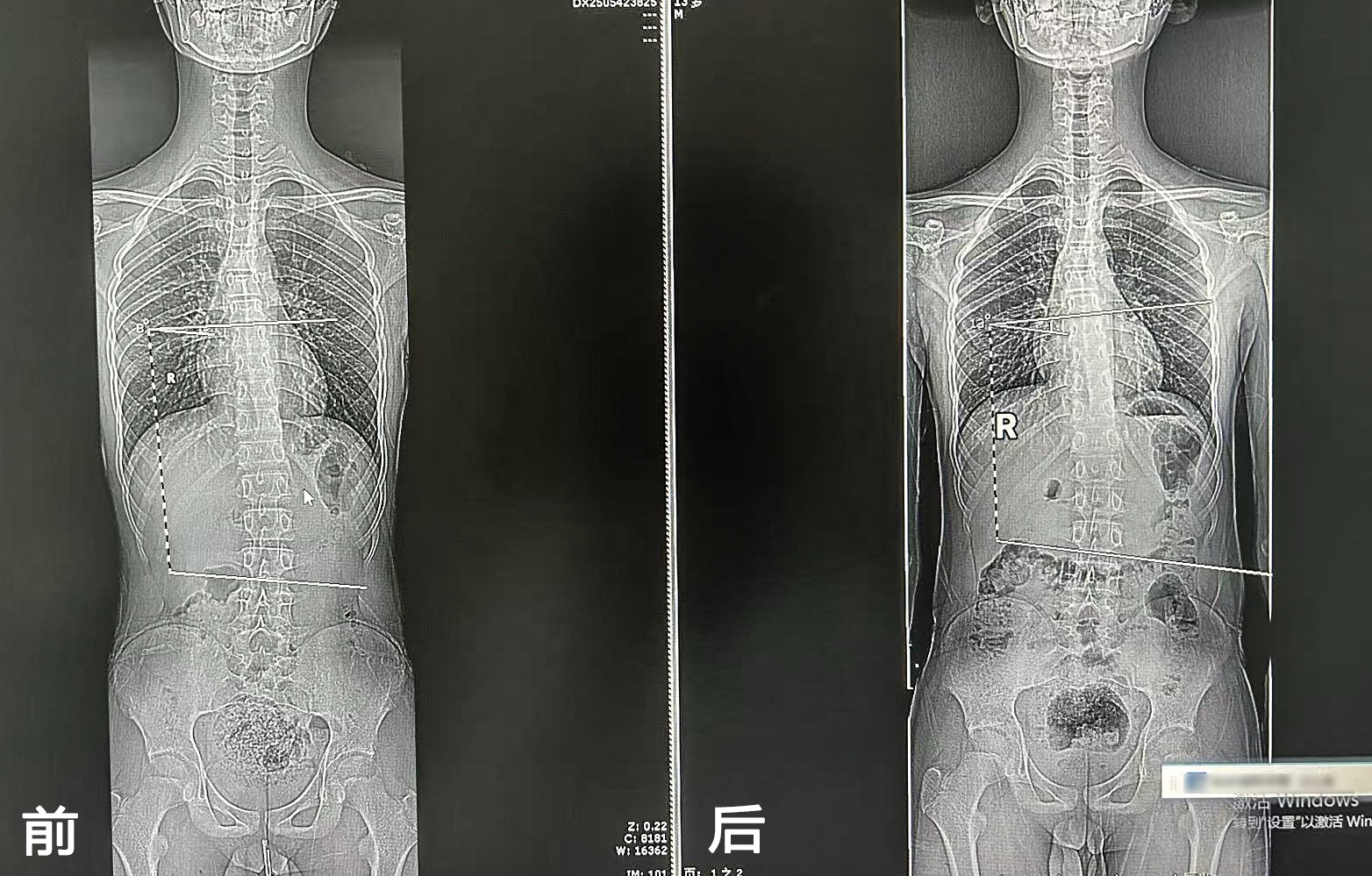 患者,女,13歲。2024年在滕州市學生常見病(四防三進)防控專家進校園活動中查體發現體態異常,含胸駝背、剃刀背明顯,脊柱側彎(T8-L3:13°)。每周在我院康復醫學科行康復訓練一次,經過4個月康復訓練,復查脊柱側彎(T8-L3:8°),含胸駝背體態較前改善明顯。
