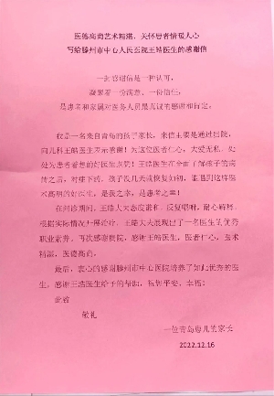 【滿意滕州】侯賀斌醫生,你有一封感謝信,請查收!