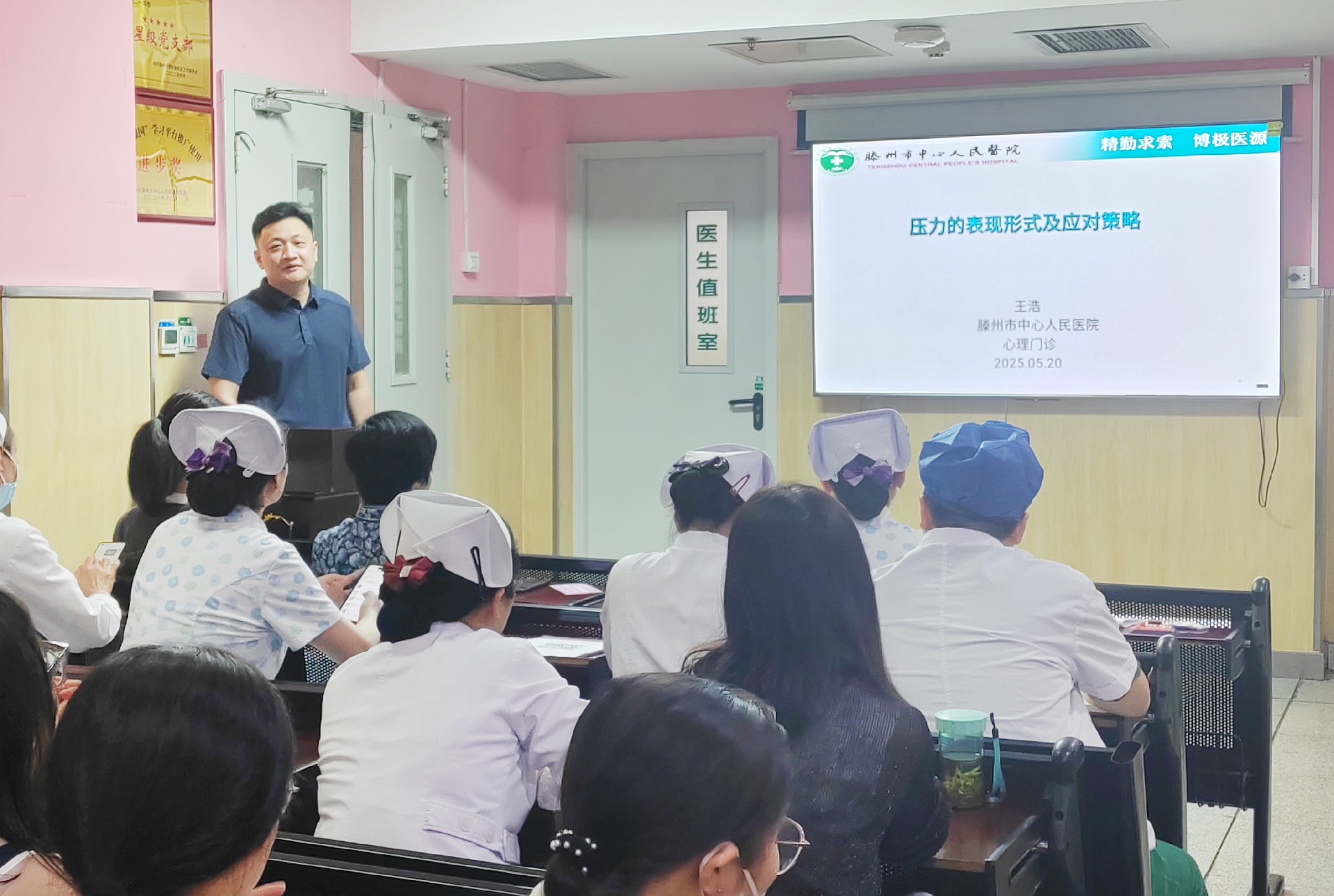 活動中,臨床心理科主治醫師、國家二級心理咨詢師王浩,圍繞“壓力的表現形式及應對策略”展開深入講解。他結合豐富的臨床案例,剖析了壓力在生理、心理和行為等方面的表現,并現場示范手指減壓操、蝴蝶抱情緒穩定法等實用技巧。參與者通過沉浸式體驗,掌握了將正念呼吸、漸進式肌肉放松等心理學方法融入日常工作和生活的訣竅。