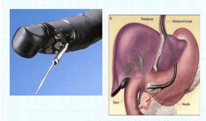 EUS-FNA是近年來消化內鏡領域的最大進展之一。首先把扇形超聲內鏡插入食管或胃腸腔,通過內鏡前端超聲探頭掃查發現食管、胃或腸壁周圍如胰腺、膽管、肝臟、縱隔和盆腔等部位的病變,進行準確定位,然后通過超聲內鏡管道插入穿刺針,并在超聲內鏡彩色多普勒的引導下避開大血管和重要組織結構,穿刺入目標組織,通過穿刺針提插的方法獲取病變的細胞和組織用于病理學,從而幫助確定病變的性質、組織學來源和病理學特征,這對于制定下一步的治療方案具有重要的指導意義。當腫瘤的性質已經確定時,EUS-FNA有助于鑒別淋巴結和其他器官的轉移病灶,分期的準確性對治療方案的選擇至關重要。