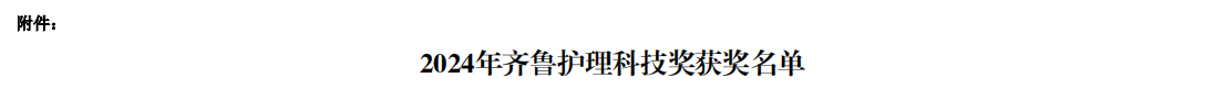 齊魯護理科技獎是經山東省科技廳備案、山東省護理專業領域的最高科學技術獎項,是與“山東醫學科技獎”齊名的護理領域科研獎項。2024年齊魯護理科技獎經過嚴謹縝密的專家兩輪評審、項目現場答辯、全省公示等環節,最終評選出39項優秀科技成果進行授獎,其中一等獎1項、二等獎10項,三等獎28項。