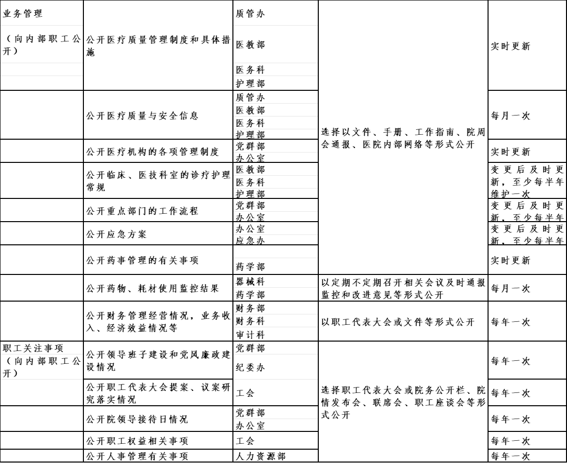 1.建立健全醫院院務公開的各項規章制度,明確公開的內容、程序、方式、時限和責任等,確保院務公開工作的規范化和制度化。