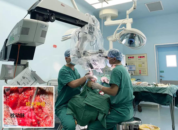 患者女,60歲,右側枕頂部持續搏動性疼痛3月余,曾就診于齊魯醫院、省立醫院等多家門診,口服藥物,效果差。患者來我院頭面痛門診就診時已嚴重到每日無法睡眠,痛苦不堪。郝懷勇主治醫師為患者體格檢查后找到罪魁禍首為患者枕部的枕大神經,經過顯微鏡下行“枕大神經血管減壓并部分切斷術”,患者疼痛徹底消失,次日出院,門診隨訪無復發。