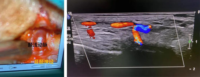 患者女,65歲,雙側顳部及枕部持續搏動性跳痛30余年,就診我院頭面痛門診。郝懷勇主治醫師經過細致的體格檢查,發現引起她頭痛的根源是顳部的耳顳神經和枕部的枕大神經。借助術中超聲,在李永濤主任醫師指導下,郝懷勇主治醫師在顯微鏡下為患者行“耳顳神經及枕神經微血管減壓術”。術中發現神經與周邊纖維筋膜組織黏連緊密,顯微鏡下松解神經被卡壓部位,并處理纏繞神經的血管。術后疼痛消失,門診隨訪無復發。