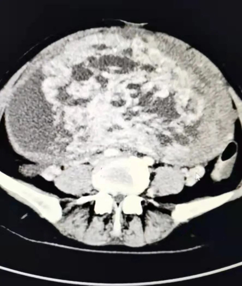 患者女,50歲,平素月經規律,無痛經,無異常陰道流血,近半月來出現無明顯誘因腹脹、輕度腹疼、小便頻,來我院消化內科就診,發現腹部異常膨隆,彩超見一巨大囊實性包塊,較大切面范圍約22.7*18.1CM,部分切面與宮底肌層關系密切,其內囊性部分呈多房樣改變,實性部分血流信號豐富,CA125 98.85U/ml,以“盆腔包塊瘤”收入婦二科。
