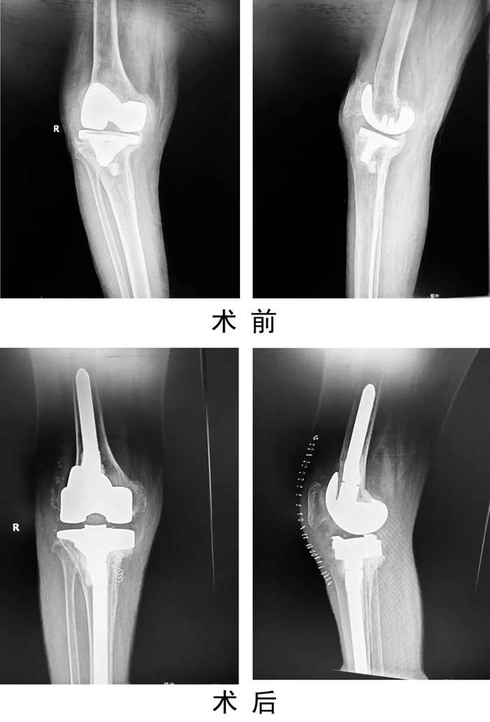 患者入院后,關節運動醫學二科手術團隊制定嚴密的手術計劃,為患者實施了一期右膝人工關節翻修術,一次手術清除原假體,徹底清創后,重新植入翻修假體。手術后患者右膝刀口一期愈合出院,患膝功能良好,疼痛緩解。復查感染指標C反應蛋白4.45mg/L。