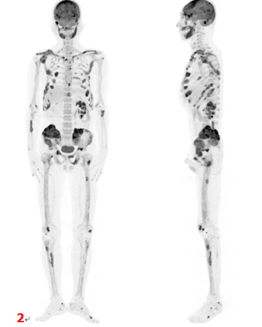 全身多發(fā)骨骼(包括四肢骨和中軸骨)骨質破壞(圖2),部分伴軟組織腫塊形成,顯像劑攝取明顯增高,其中右側髂骨SUVmax約13.0。