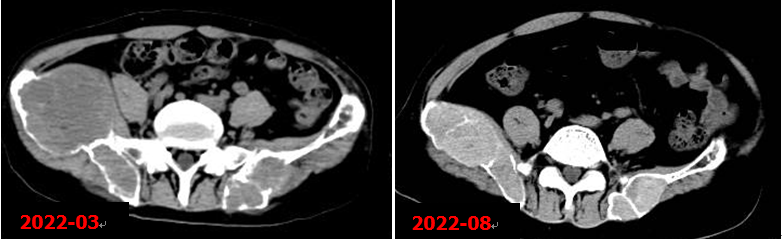 右側甲狀旁腺腺瘤切除術后,甲狀旁腺MIBI顯像未見明確病灶組織殘留征象。術后5個月本院復查CT示右髂骨病變明顯縮小。