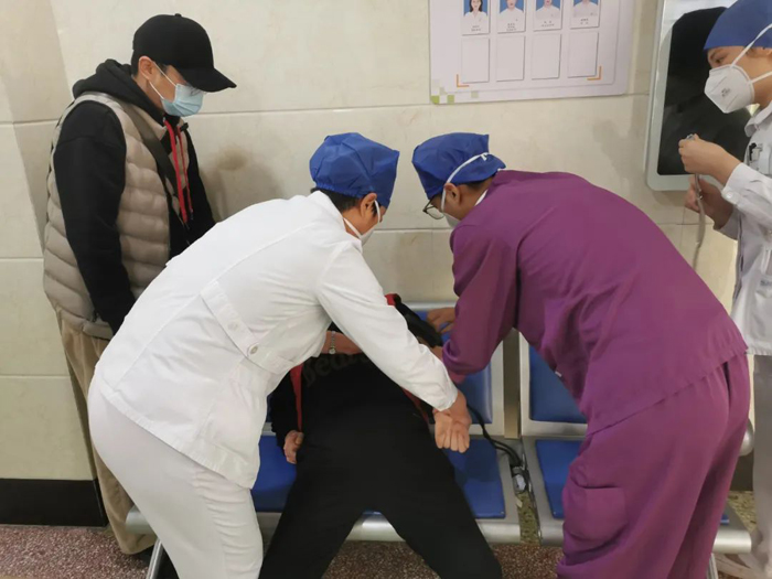 褚瀟曼護(hù)士即刻撥打門診區(qū)域急救電話61575請求協(xié)助,張厚玲護(hù)士長攙扶患者平臥并測量血壓(80/52mmHg),馬學(xué)良副主任和李盼盼醫(yī)師判斷患者生命體征。