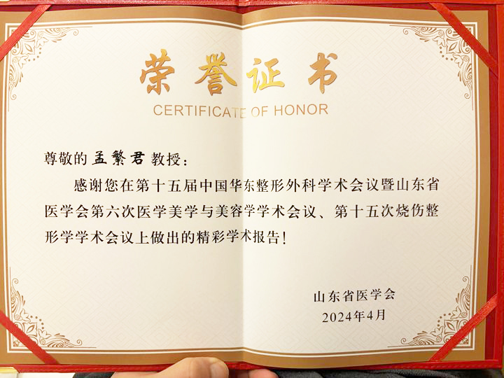 近日,第十五屆中國華東整形外科學術會議暨山東省醫學會第六次醫學美學與美容學學術會議、第十五次燒傷整形學學術會議在濟南舉行。我院整形美容科主任孟繁君受邀參加,并當選為山東省醫學會醫學美學與美容分會委員,同時作了專題學術演講發言。