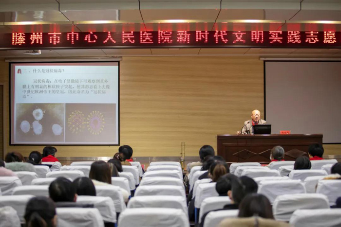 首先,感染病科主任楊列永主任醫師以“萬眾一心、抗擊疫情”為主題,從什么是新冠病毒及其傳染途徑、醫院專業人員防疫優先意識、教師和學生應注意的事項三方面做了專題講座。講座詳實、具體、有效,更加深入認識病毒,更清楚在當前應注意的問題,他的講座受到了與會教師的一致肯定和充分認可。