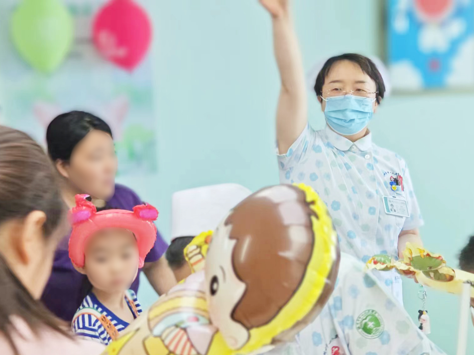 醫護聯合查房的同時也為孩子們送上精美的兒童節禮物,可愛的“各色氣球棒”穿梭在病房間,把孩子們平日里對“白大褂”的恐懼變成對“卡通醫護”的喜愛。