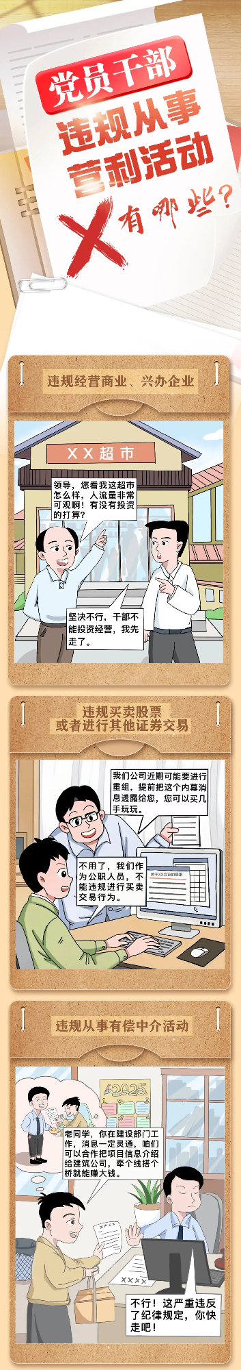 《中國共產黨紀律處分條例》第一百零三條規定,違反有關規定從事營利活動,有下列行為之一,情節較輕的,給予警告或者嚴重警告處分;情節較重的,給予撤銷黨內職務或者留黨察看處分;情節嚴重的,給予開除黨籍處分:(一)經商辦企業;(二)擁有非上市公司(企業)的股份或者證券;(三)買賣股票或者進行其他證券投資;(四)從事有償中介活動;(五)在國(境)外注冊公司或者投資入股;(六)其他違反有關規定從事營利活動的行為。